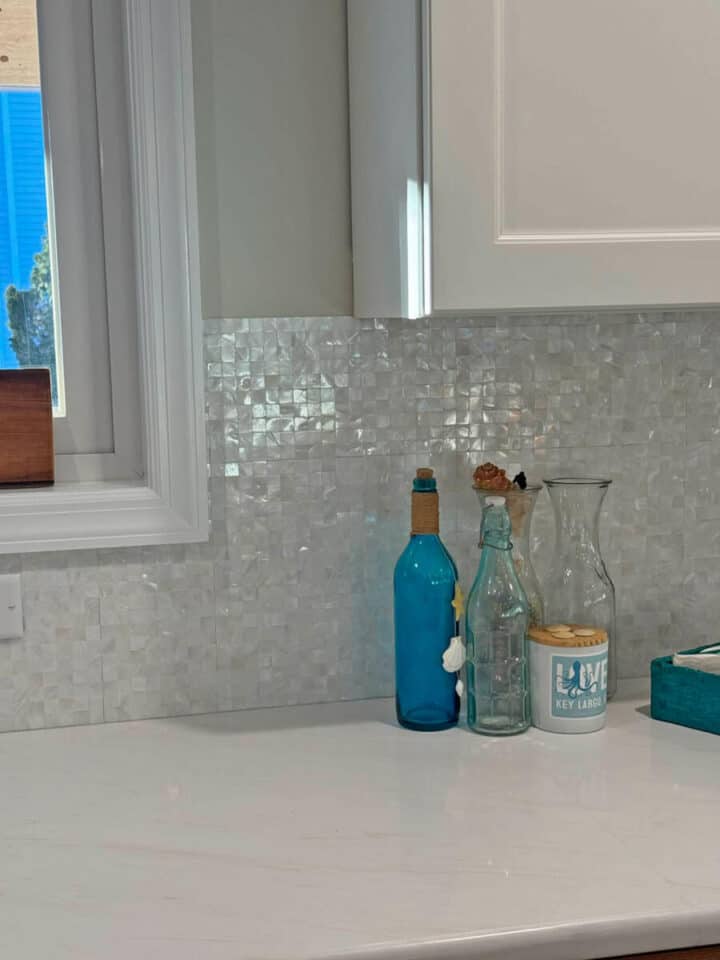 The backsplash is mother-of-pearl, and it subtly reflects light and adds a little sparkle to the kitchen.